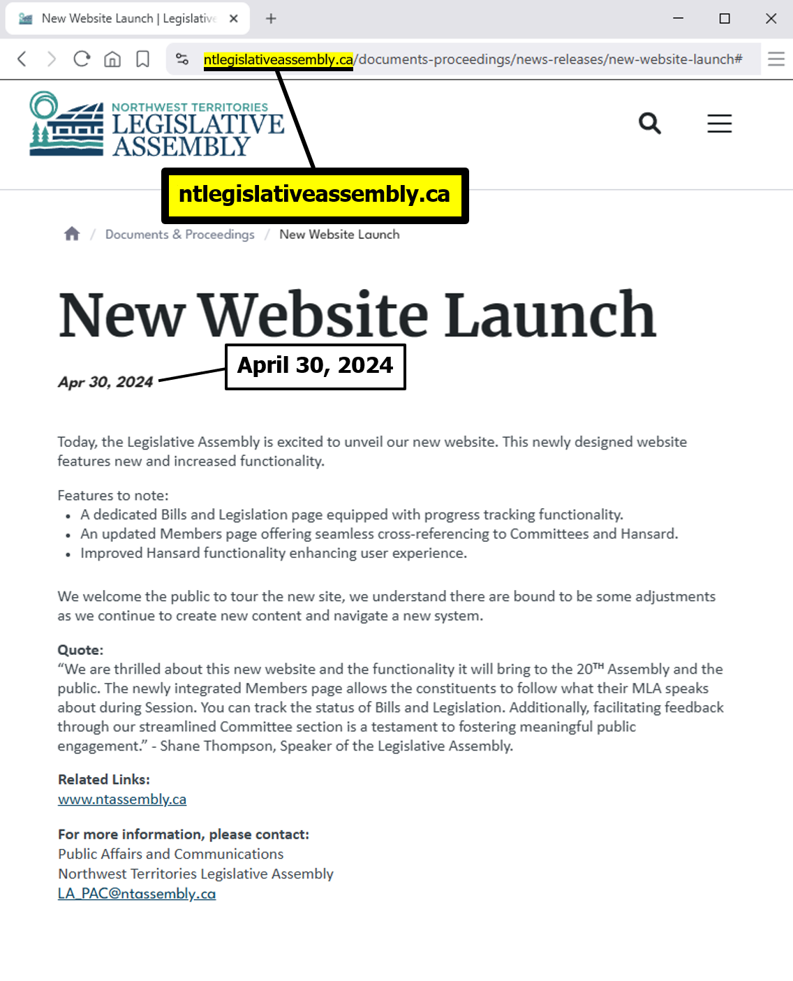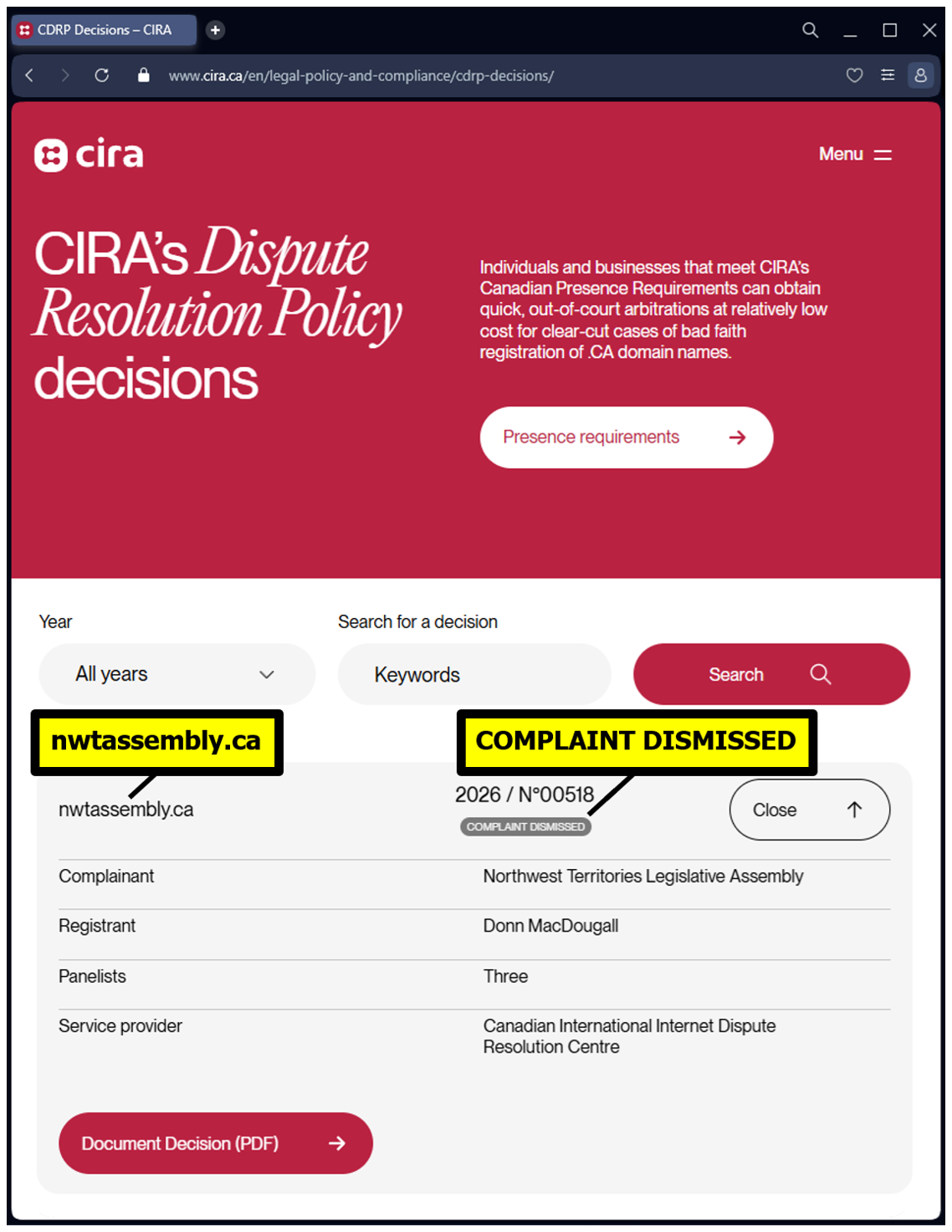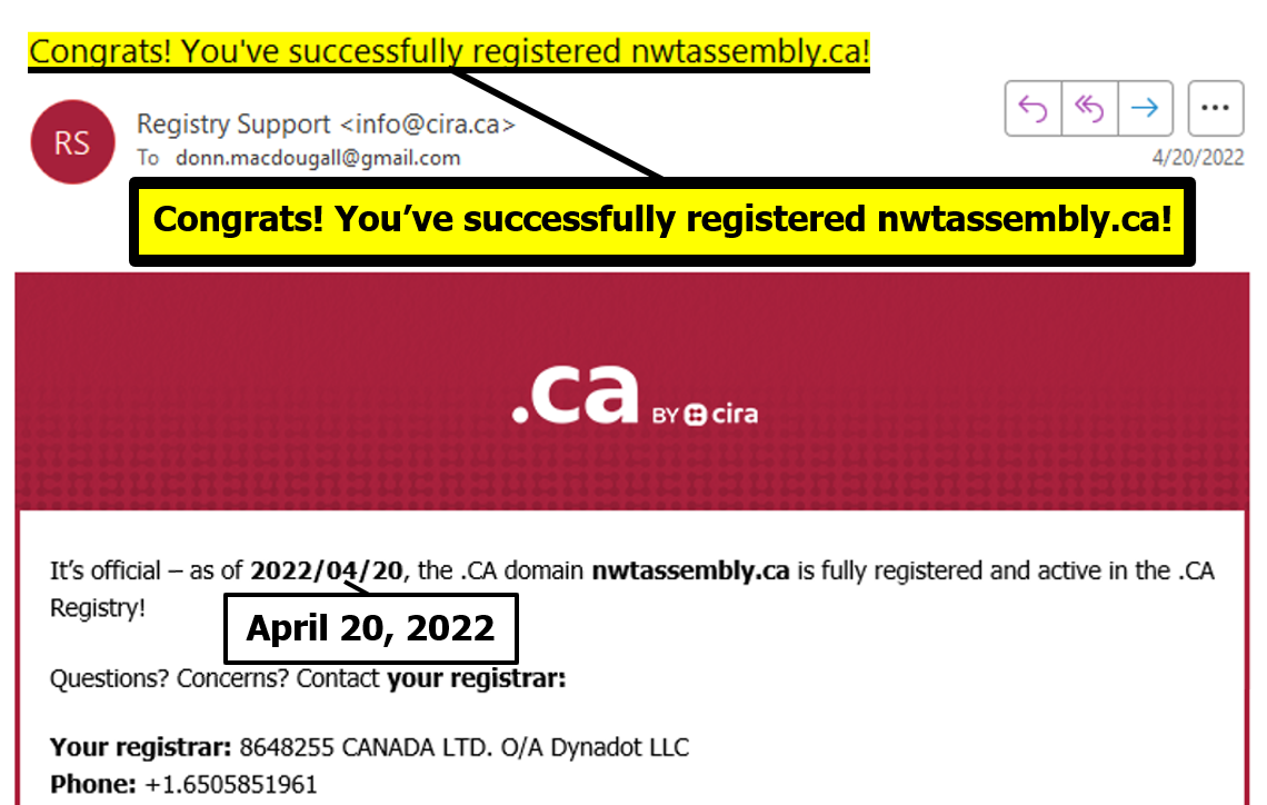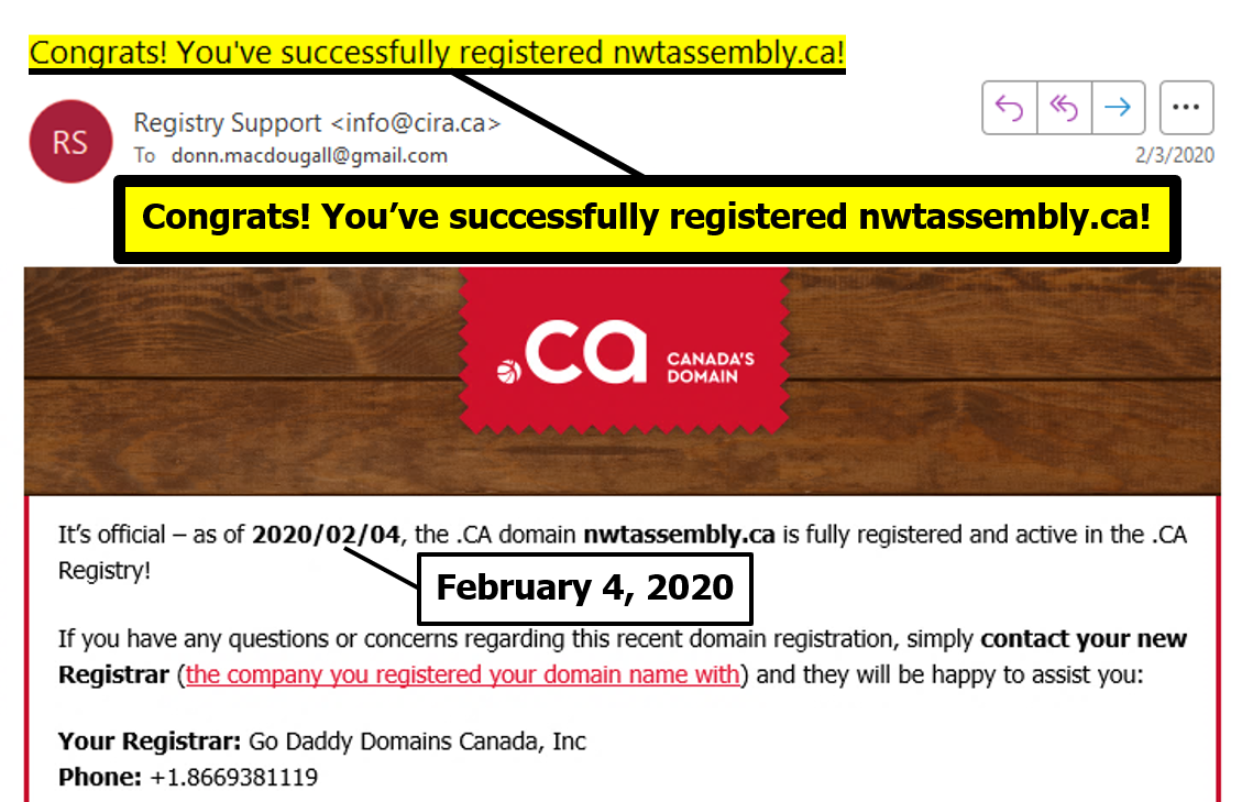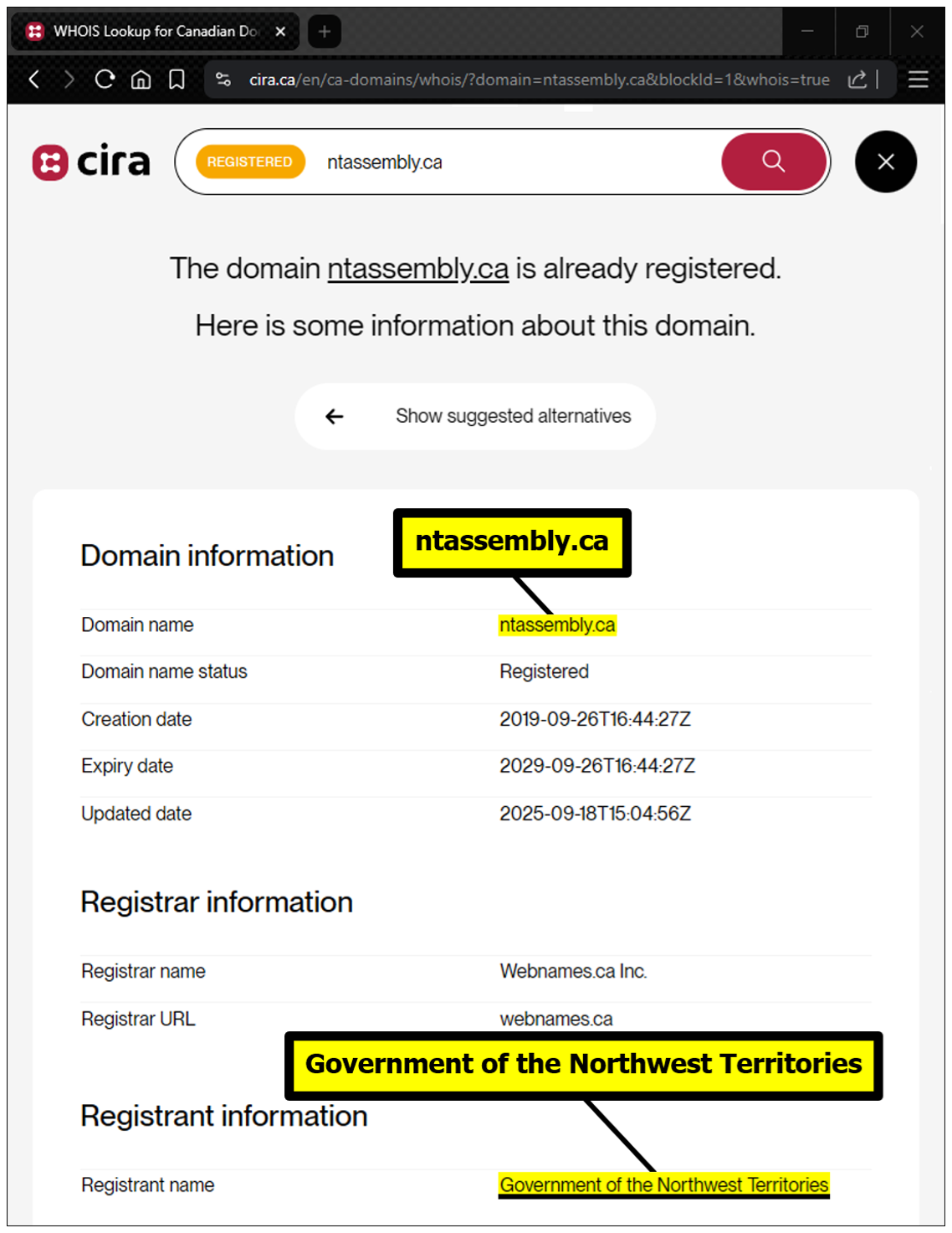 "the NTLA owns the domain name www.ntassembly.ca" is FALSE:
